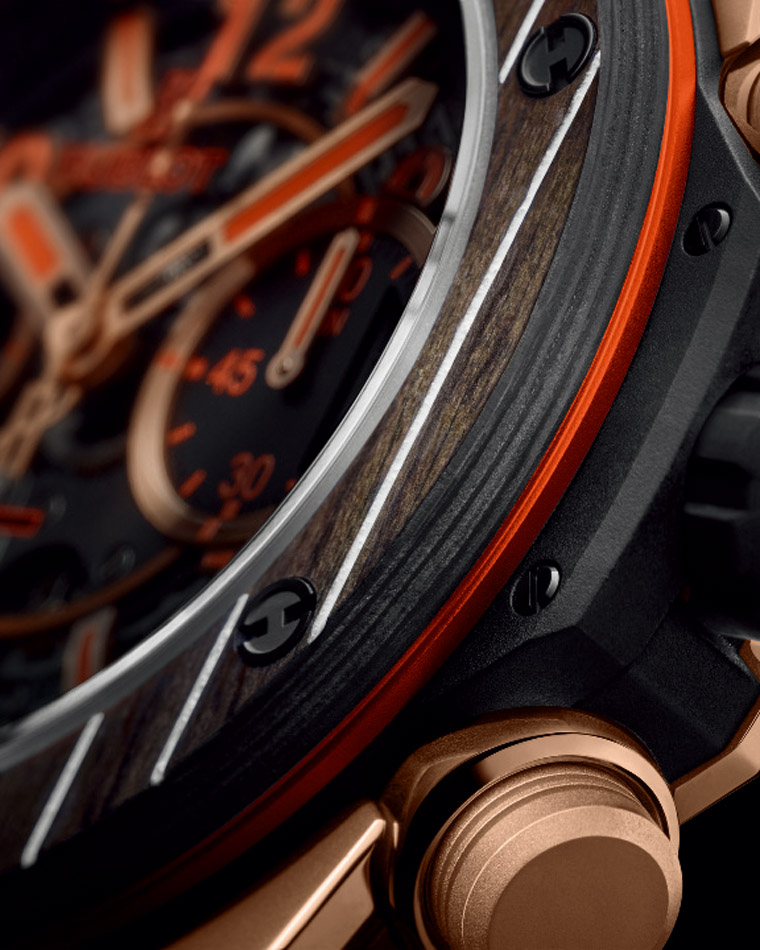 ▲表壳採用碳纤维及柚木材质,展现宇舶融合的艺术之品牌精神。