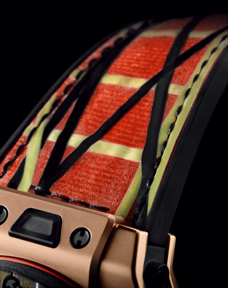每一只Big Bang Unico Italia Independent柚木腕表配有两条表带。第一条设计灵感来自帆船制材的克维拉复合碳纤维,并结合橡胶材质。第二条则是具有条纹的黄橙色橡胶表带。这款腕表採用宇舶革命性的One Click单键快拆式表带系统,两条表带能快速轻松更换。并搭配一只ITALIA INDEPENDENT太阳眼镜,其框架正如同这款腕表的表壳採用柚木材质。