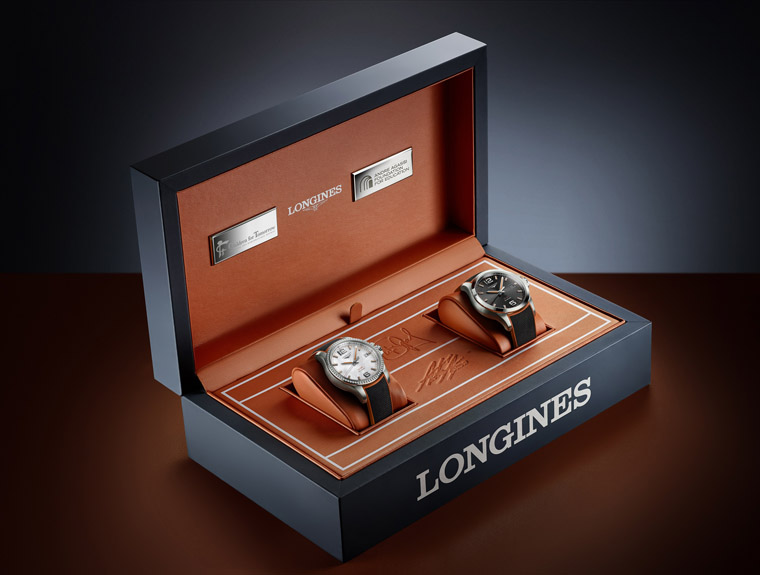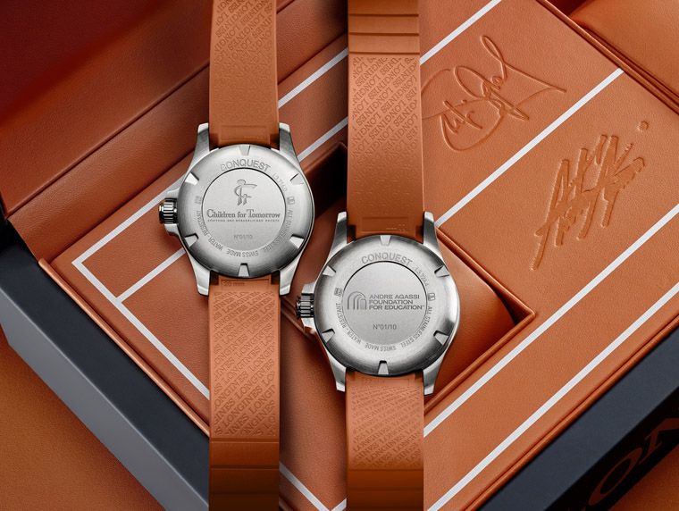 「Conquest征服者系列V.H.P.葛拉芙&阿格西基金会特别款」男士表款为黑色面盘,女士款则为白色珍珠母贝面盘,表壳镶嵌精致的70颗钻石。LONGINES为了向担任官方计时的法国网球公开赛致意,两款腕表的指针、时标和橡胶表带皆以橘色点缀,来象徵巴黎经典的罗兰高地红土球场。两款表的背盖皆有雋刻标志,男士款为”The Andre Agassi Foundation for Education”,女士款为”Children for Tomorrow”。最后,特别设计的腕表收藏盒亦採用法国网球公开赛的色系,其盒内珍藏着编号1至10的两款独家设计腕表。