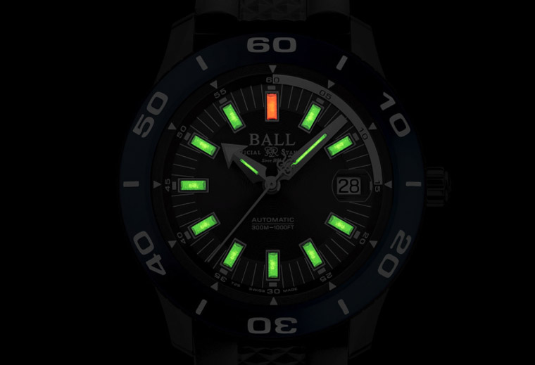 BALL WATCH H₃自体发光微型气灯令佩戴者可在最黑暗的环境中清晰读时。品牌将H₃气体密封在微型玻璃试管内,当H₃气体粒子撞击管内的内部着色表面时,光能量就会被释放出来。这现象可以持续长达25年,而无需任何外界光线或能源进行补充,指针及表面上由13支气灯所组成,自体发光微型气灯的亮度比一般传统的夜光涂漆高100倍。