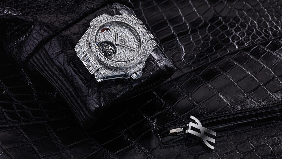 ▲Big Bang珠宝巨鱷陀飞轮总共镶嵌多达380颗钻石,其中面盘上的镶钻设计乃是参考自鱷鱼皮纹理,与鱷鱼皮表带甚至是鱷鱼皮夹克彼此呼应。