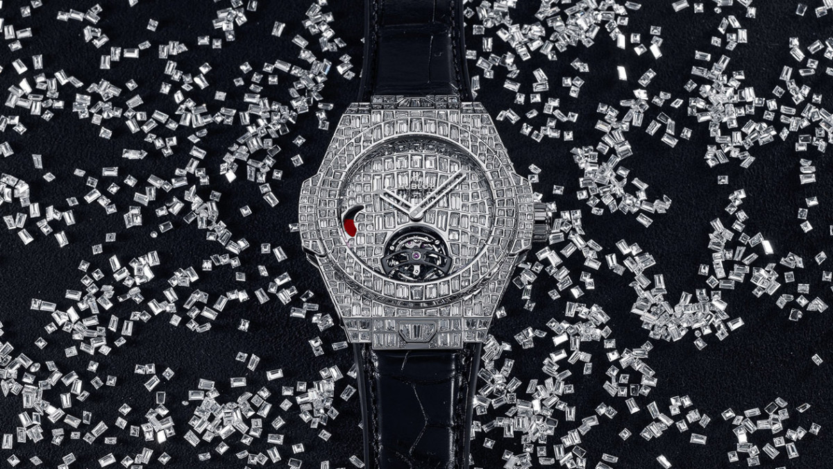 这款奢华耀眼的满钻陀飞轮腕表镶嵌380颗方型钻石,鳞片状排列于表壳、面盘和表扣上。钻石的大小和形状布局经过精心设计,宛如鱷鱼皮纹理般的精致而富有层次感。其中面盘镶嵌了102颗方型钻石(总重4.3克拉)。 6点钟位置设有透视视窗,可以尽情欣赏HUB6016陀飞轮机芯的韵律动作。手动上链机芯藏于45毫米直径的表壳中,拥有115小时动力储存。表壳则镶嵌234颗方型钻石(总重7.6克拉),与鱷鱼皮表带上的表扣亦镶嵌了44颗长方形钻石(总重1.6克拉)相映生辉。