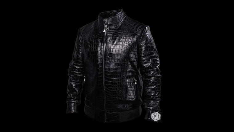 ▲这款飞行员夹克採用黑色鱷鱼皮制成,并以独特的碳纤芳纶混编面料作为裡衬——这种由多层碳奈米管织物精心编织的面料可以在加强防护性的同时不增加体积。