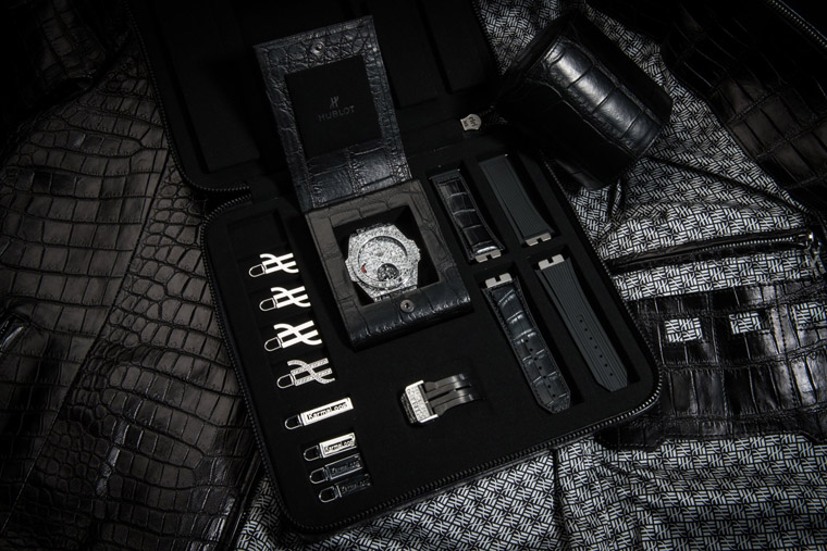 Big Bang珠宝巨鱷陀飞轮腕表与KARMALOOG黑色鱷鱼皮夹克组合还将搭配一款专门放置腕表的公事包,方便存放于保险箱。以上奢华单品连同一个小尺寸表盒共同放置于黑色皮质运动袋之中。首位获得这组百万美金尊崇礼盒的收藏家正是保持了五十场不败战绩的传奇拳王弗洛伊德.梅威瑟!
