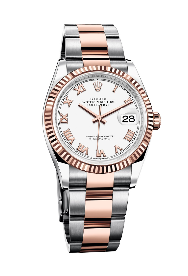 18 ct永恒玫瑰金、不锈钢材质/3235自动上链机芯/时、分、秒、日期显示/蓝宝石水晶镜面/防水100米/表径36mm