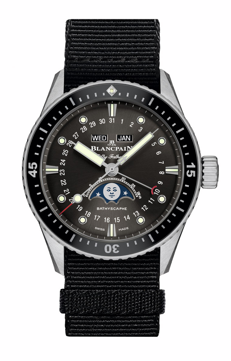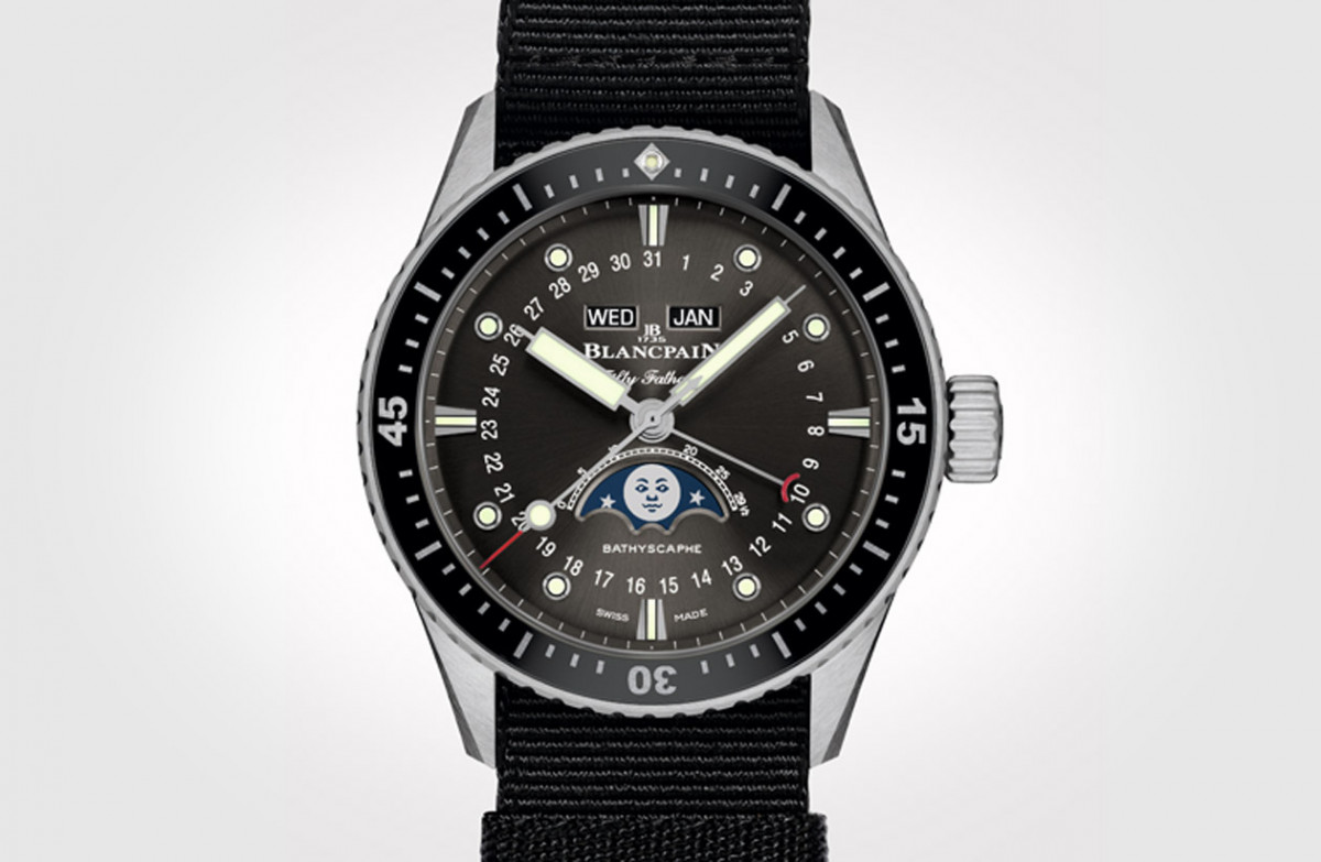BLANCPAIN宝珀于1970年代全面改革了其Bathyscaphe系列产品,为这潜水腕表注入全新的美学标准,其特点包括面盘上的镀银圆环附以长方形时标,并在每五分钟位置以阿拉伯数字作标记。宝珀取材这独特风格,并带来全新的五十噚深潜器七○年代日期及星期腕表,面盘採用1970年代表款的外观,备有原版于3时位置的星期及日期显示。