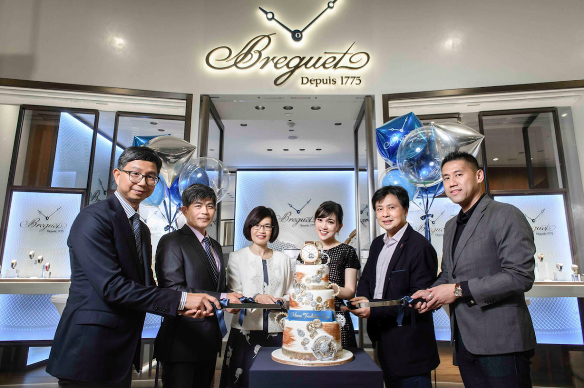 ▲由左至右:世界腕表总编萧仲均先生、腕表生活志总编陈志和先生、台北101购物中心营运长朱丽文小姐、宝璣台湾副总经理王美云小姐、时间观念总编郭峻彰先生以及城邦名表总编刘必祥先生。