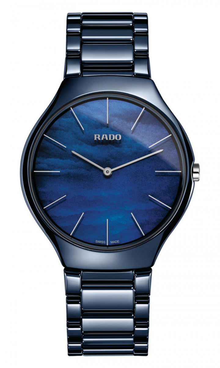 蓝色珍珠母贝面盘搭配湛蓝色高科技陶瓷表壳与链带,特殊海洋色系定调整体表款色系,让人联想起大海的起伏、自然的美好,在日益城市化的生活中,这时刻让海洋般的午夜蓝唤醒视觉活力,激发无限灵感。只有雷达表能创造高科技陶瓷纯粹单一的自然色彩,True Thinline Nature真我超薄自然系列腕表採用独特的面盘处理技术,腕表将不再只是腕表,昇华为一件停驻于腕间的独特珍品,为大自然爱好者带来平静舒缓的视觉享受。