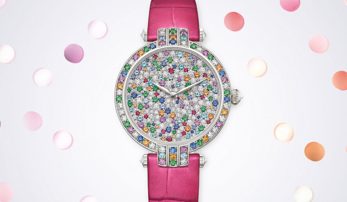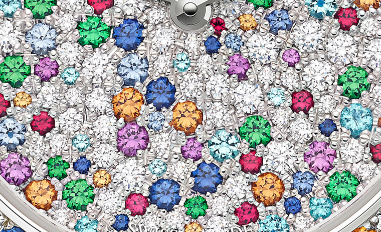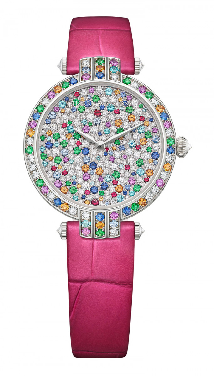 ▲海瑞温斯顿运用精湛的雪花镶嵌工艺替表款镶上各色宝石,此工艺的难度在于将宝石紧密排列,隐藏金属部分,彰显每一颗宝石的璀璨光芒。