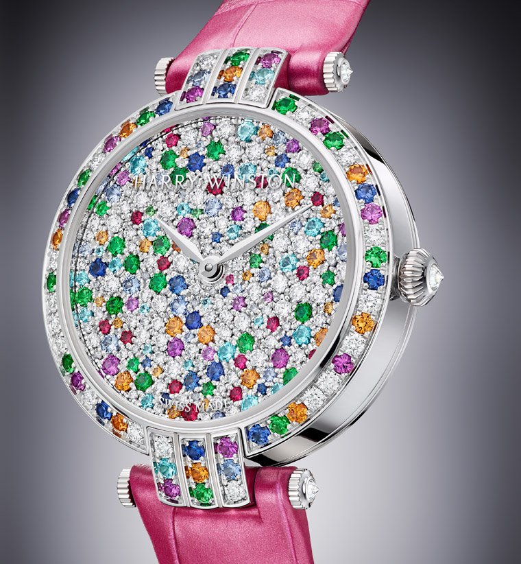 ▲Premier Winston Candy腕表分别镶有108颗钻石、25颗蓝色帕拉依巴碧璽、24颗深绿色沙弗莱石、24颗浓橙色锰铝榴石、17颗深蓝色和17颗浅蓝宝石、16颗红色尖晶石和13颗粉红刚玉,华丽非凡。