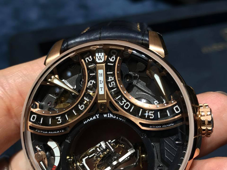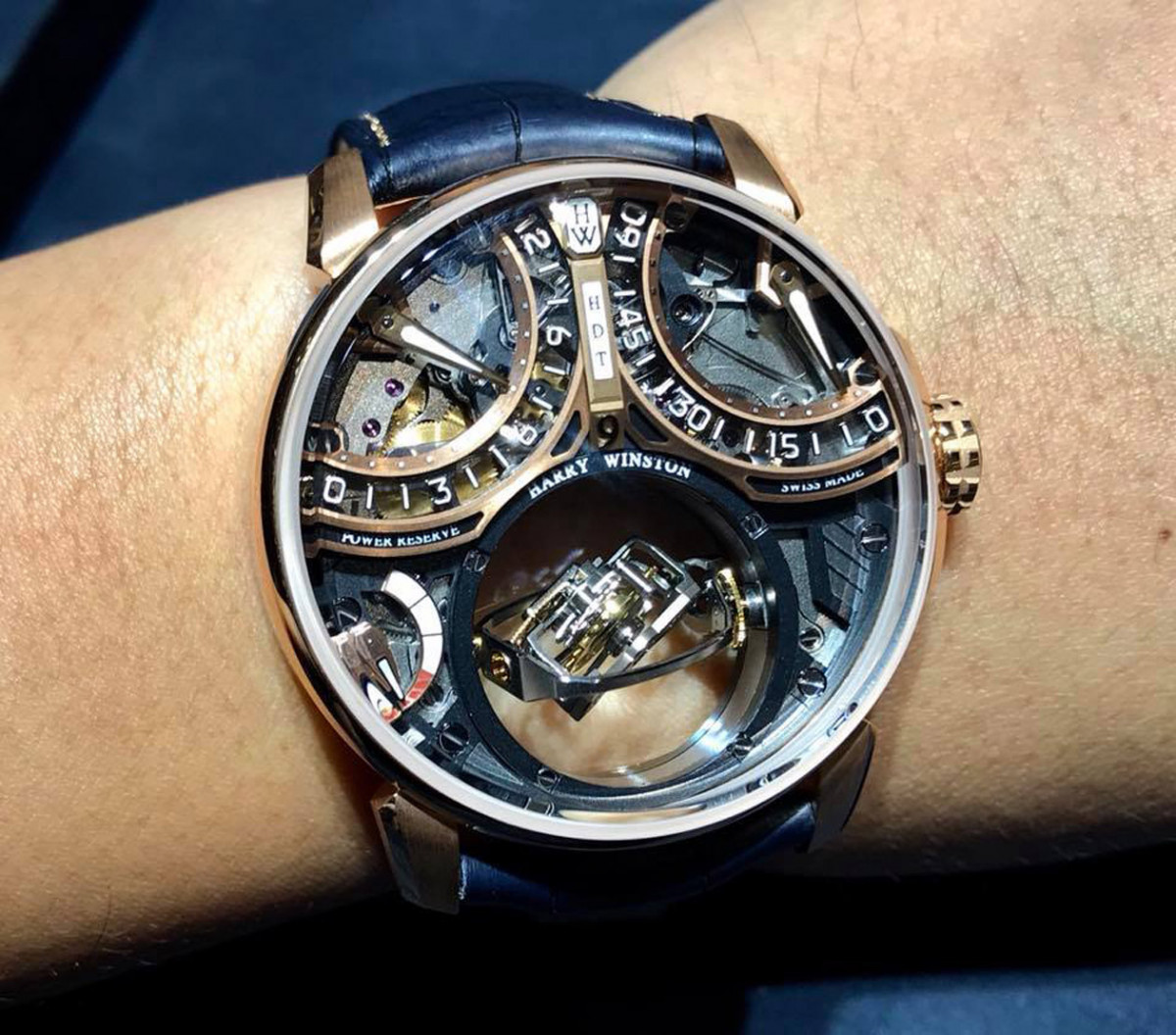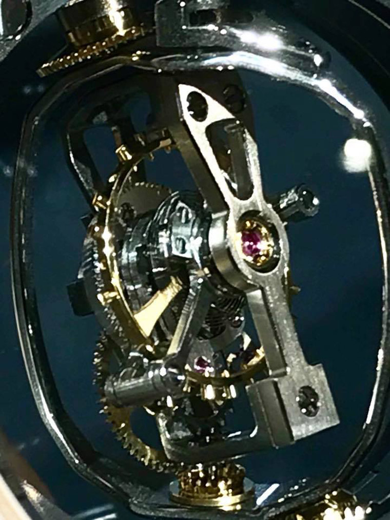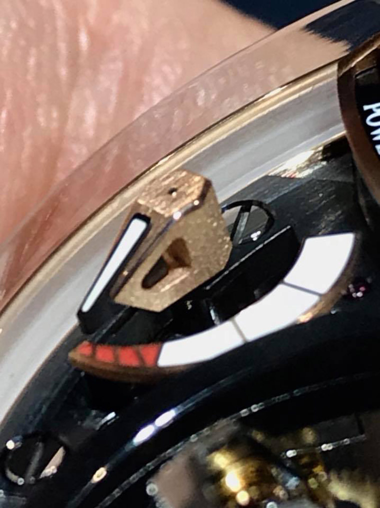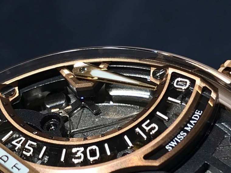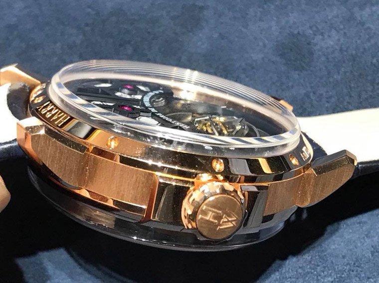 HW陀飞轮9号,手上链玫瑰金三轴陀飞轮。特殊的逆跳时间指示,善用空间不会影响到陀飞轮的美观,立体的动力储存指针,感受到其细节的用心,陀飞轮框架达20.5mm并採透空设计,增添了整个陀飞轮的漂浮感。三轴中,第一个框架每300秒转动一圈;第二个框架每75秒转动一圈;第三个框架每45秒转动一圈。宛如星球的运转般,加上了上下复古式弧形蓝宝石镜面,更是强化了整体的透视度、因此整个三轴陀飞轮内部的拋光打磨、连动旋转的细致工艺都一览无遗,由此也可以感受到该品牌对腕表世界的企图心!