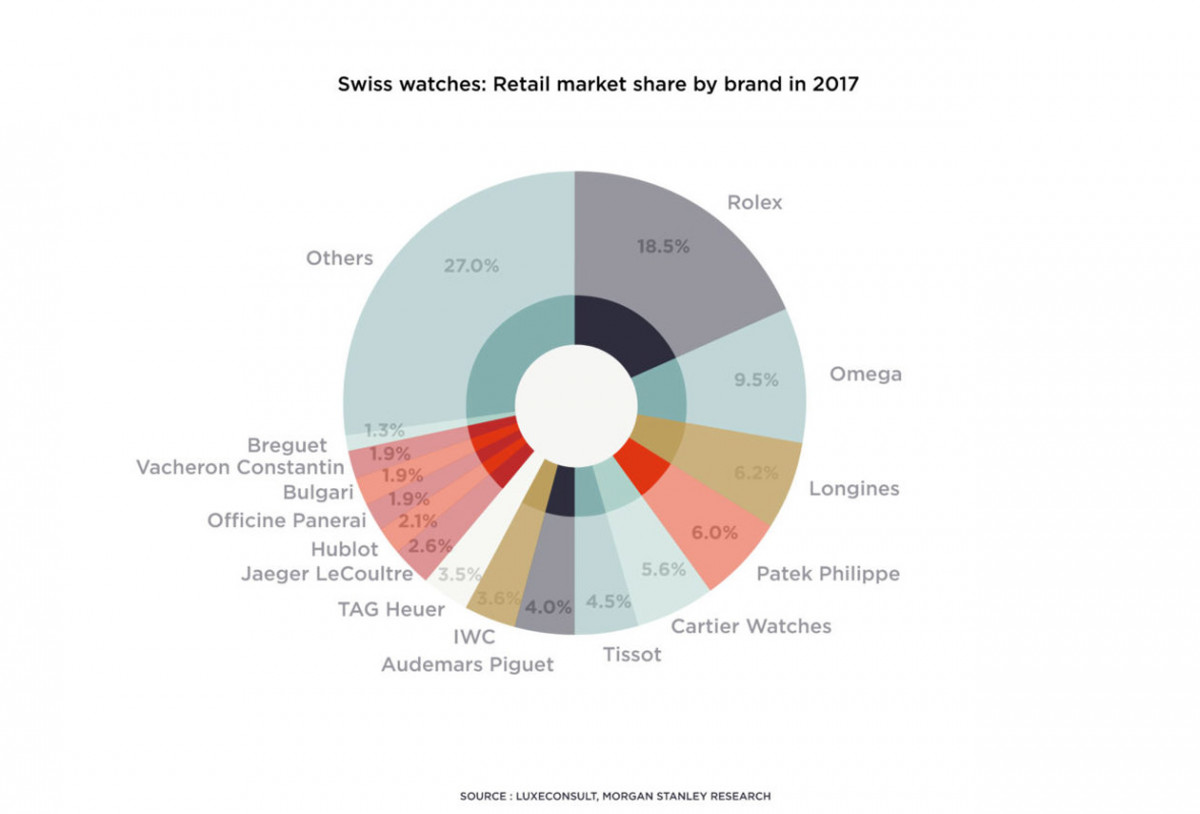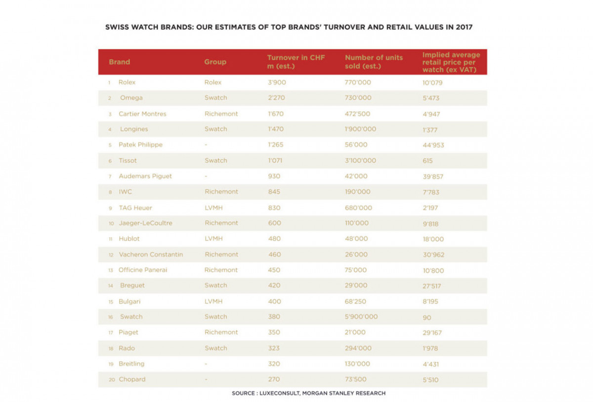 摩根史坦利透过对市佔率的分析展开他们的报告:「根据我们的估计,在瑞士约350个钟表品牌中,仅有6个品牌2017年营业额超过10亿瑞郎,包括劳力士、欧米茄、卡地亚、浪琴、百达翡丽和天梭。」(根据爱彼首席执行官Bennahmias的说法,爱彼在2018年第一季的销售额同比增长了9%,仅在2018年3月底达到了12个月的定额滚动基准,达到了10亿瑞郎的门槛)。这份报告详细阐述了个别品牌的营业额,榜单从劳力士开始,其2017年净销售额估计为39亿瑞士法郎,销售量为770,000只手表。