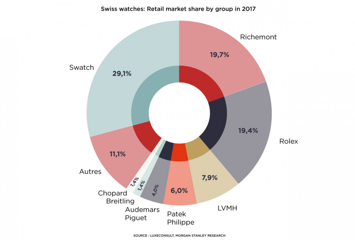 根据摩根史坦利(Morgan Stanley)的一份新报告显示,瑞士钟表集团包括Swatch Group、劳力士以及LVMH和Richemont旗下的手表品牌,在2017年总共佔瑞士手表销售额的四分之三,这显示了大集团市佔率还是相对高档。