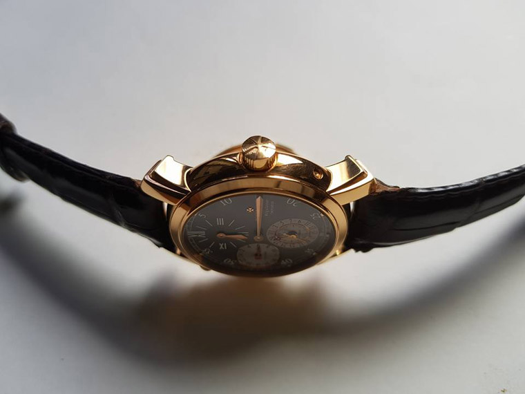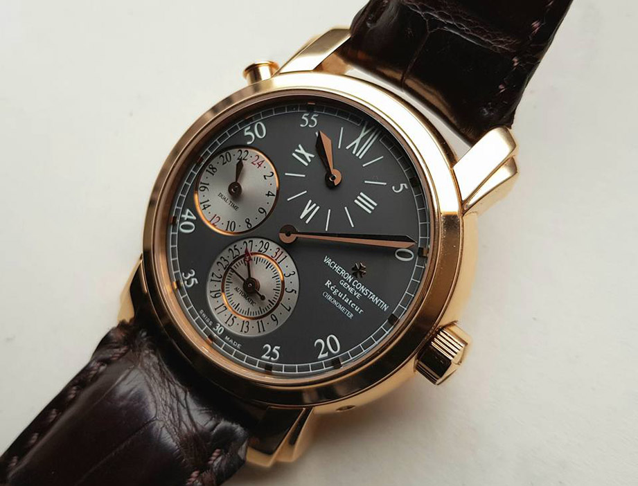Regulator Dial又称标准时计腕表或规范指针面盘。它是18世纪法国制表师Ferdinand Berthoud所发明,主要设计概念是让三根指针以不同组件驱动,可减低能量耗损,以提高走时精准,当年用来对时,故称「标准时计」。现今若三根指针在同一条直线上,又称三针一线表。这只VC的Malte为少见的玫瑰金灰色面盘,限量150只,有各别的独立编号,功能强大,阶梯式表耳,可开启的后盖,有C.O.S.C.认证,很值得入手。搭载以FP 1150为基础做修改的高级机芯,震频也从原来的21600提升到28800,在当年VC的2000系列自制机芯尚未推出时,FP、JLC与GP是VC常採用的机芯。
