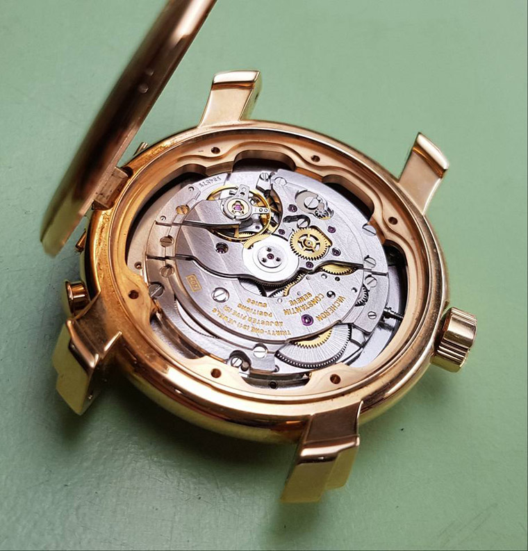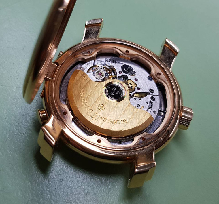 ▲拆开透视后底盖,自动盘为18K金材质。