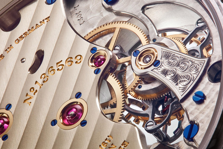 透过蓝宝石水晶底盖,可细鑑朗格表厂自制L102.1机芯的精心修饰和精准机械。机芯装饰细致,四番车桥板上的螺丝固定黄金套筒镶嵌钻石端石,并缀以手工雕刻。