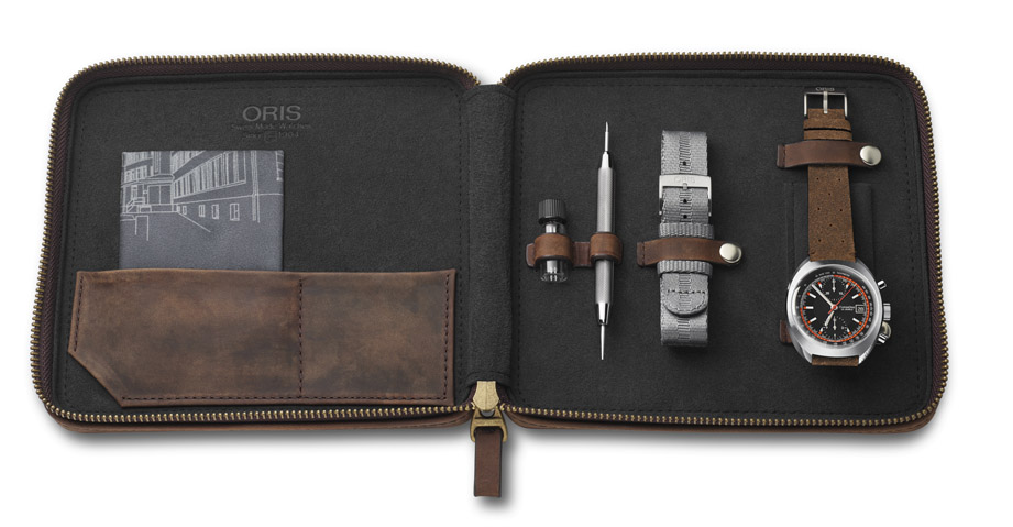 ▲Chronoris复刻计时码表拥有特殊的皮革包装,裡面随附了可替换的NATO表带和表带更换工具。