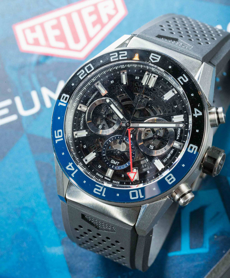 ▲TAG HEUER Carrera Heuer 02 GMT计时码表橡胶表带款。