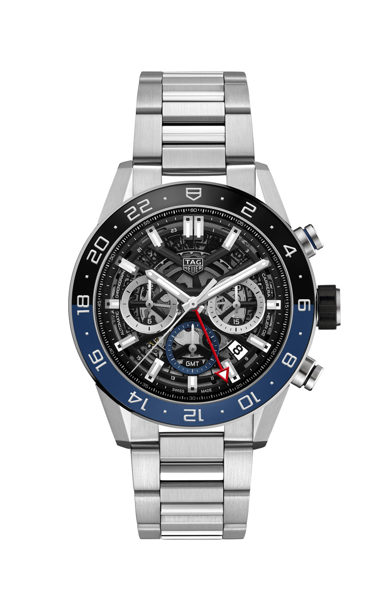 回头来看今日的TAG HEUER,此次新品首推2018年于巴塞尔钟表大展发表的Carrera Heuer 02 GMT计时码表,这款腕表乃是为Carrera系列问世55周年的纪念作品,具有GMT两地时间及全新计时码表设计。延续Carrera的DNA及TAG Heuer品牌元素,并回归1963年3-6-9计时盘配置的原创设计。分钟和小时计时盘分别设于3时和9时位置,小秒盘位于6时位置,4时30分位置为日期窗,另外新增GMT功能。这是TAG HEUER首次自制机芯家族之中加入这项复杂机制。