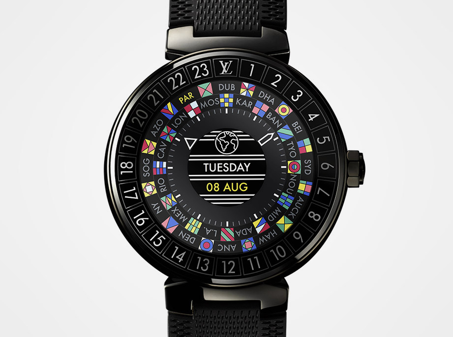 不锈钢材质/Android Wear 2.0作业系统/390x390解析度AMOLED触控萤幕/相容性Android 4.3+/iOS 9+/路易威登自订面盘/My Flight旅游功能/City Guide应用程式/防水30米/表径42mm/参考价:NT$ 91,000