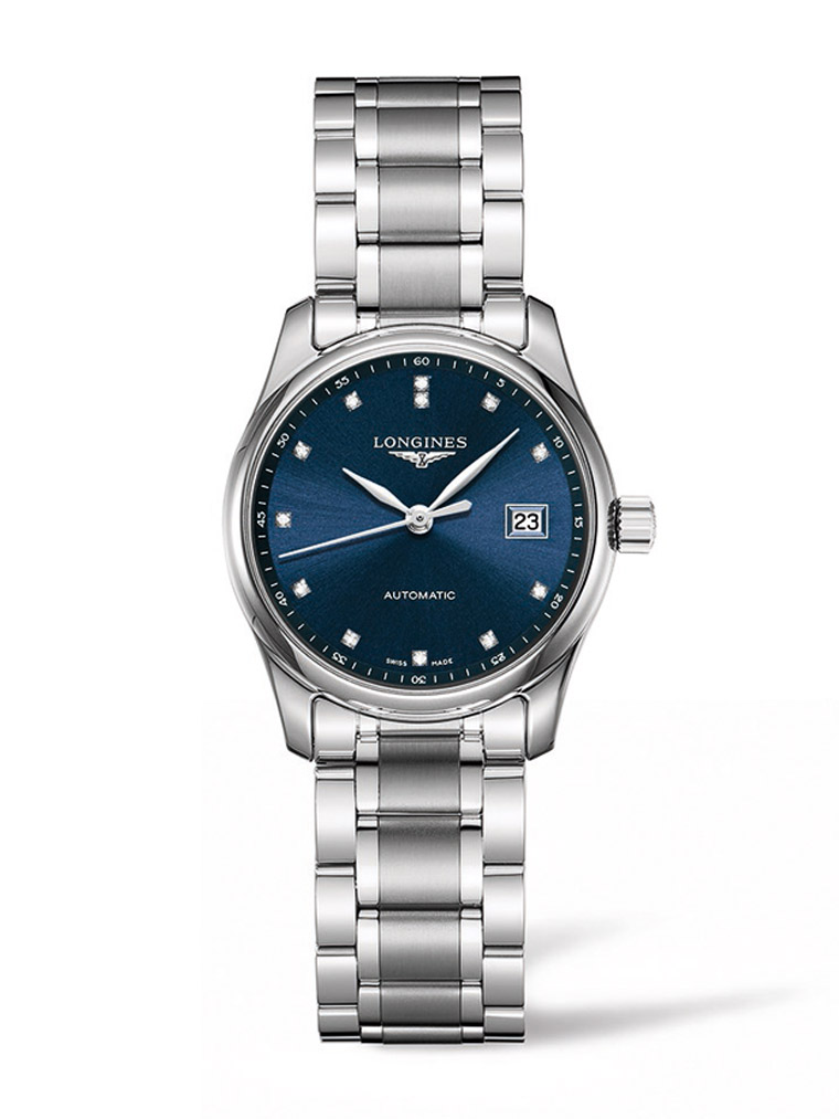 不锈钢材质/L595/592自动上链机芯/时、分、秒、日期显示/面盘镶钻12颗,约重0.034克拉/蓝宝石水晶镜面、透明底盖/防水30米/表径29mm/参考价:NT$ 71,900