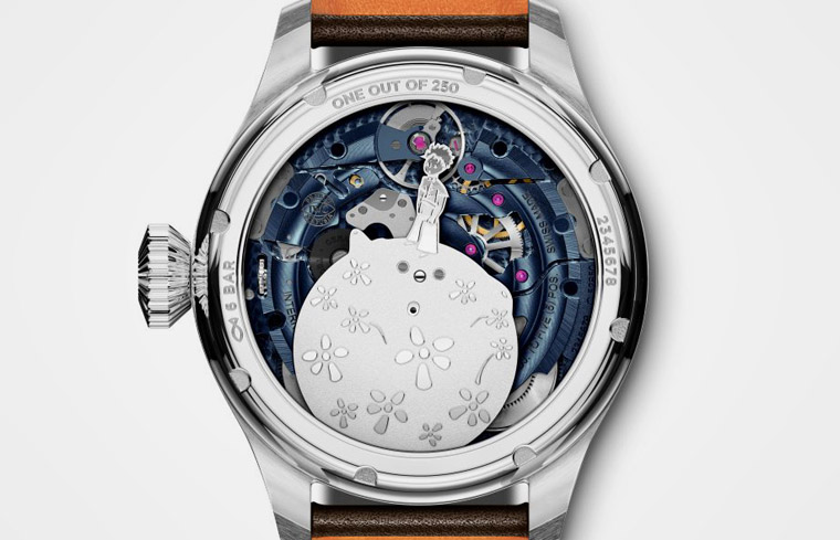 在腕表正面,年历以三个独立视窗分别显示月份、日期以及星期。其切换机制自动考虑到每个月的不同天数,需在每年的二月底透过表冠进行一次手动校正。表底盖上展示着小王子张着大大的眼睛凝神地望向天空的景象。在这副图画中,他正在自己的小小星球上,小小星球「佔据」整个自动盘,并围绕轴线偏心旋转。52850 IWC自制机芯凭藉两个发条盒的动力可以提供更大扭矩,以驱动年历显示的三个显示圆盘。此外,上满链后,双发条盒还可为长达一周的动力储备提供足够能量。