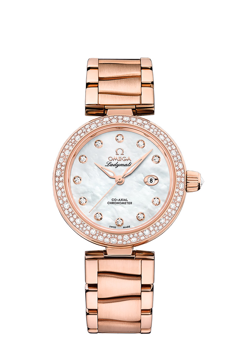 Sedna™金材质/8521自动上链机芯/时、分、秒、日期显示/表款镶钻/珍珠母贝面盘/C.O.S.C.认证/蓝宝石水晶镜面、透明底盖/防水100米/表径34mm/参考价:NT$ 1,101,800