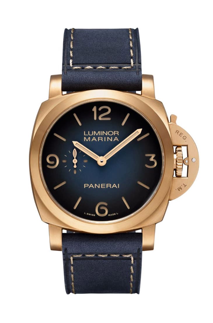 时间来到2025年,继钢款与钛金属款之后,沛纳海首度将青铜材质导入Luminor Marina系列,推出了PAM01678,这款作品在外型上回归了Luminor Marina标准的44mm表壳与护桥设计,但在性能上却有着显着的现代化升级。PAM01678採用了新世代的P.980自动上链机芯,而且虽然是Marina系列,但其防水性能却达到惊人的500米,展现不输专业潜水表的强悍规格。这款表採用了雾面渐层蓝色三明治面盘,并为了致敬1960年代的复古风格,刻意取消了日期窗,仅保留时、分与9点钟方向的小秒盘,让面盘布局更为简洁纯粹。随着青铜表壳与表圈日渐氧化生成的独特铜绿,将与渐层蓝面形成极具个性的对比美感。