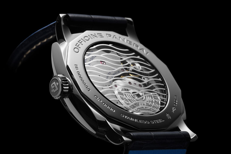 这系列新作奠基于Radiomir 1940,表示它没有表冠护桥,但是表耳又是比较粗壮的矩形,这次沛纳海推出的5款可以分成42、45和47等三种尺寸,表壳材质则有不锈钢或18K玫瑰金两种选择,而一旦你翻到表背肯定会倒抽一口气,不是因为背面有什麼惊悚的东西,而是你可能没有看过沛纳海手表出现这样的设计,这系列的透明底盖都经过一种金属化处理,所以会看到镜面上出现波浪纹装饰,就好像呼应面盘的蓝色大海联想,沛纳海这次别出心裁打破传统透明底盖的设计,也让底下的机芯多了一种若隐若现的美感。