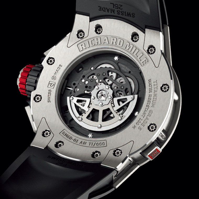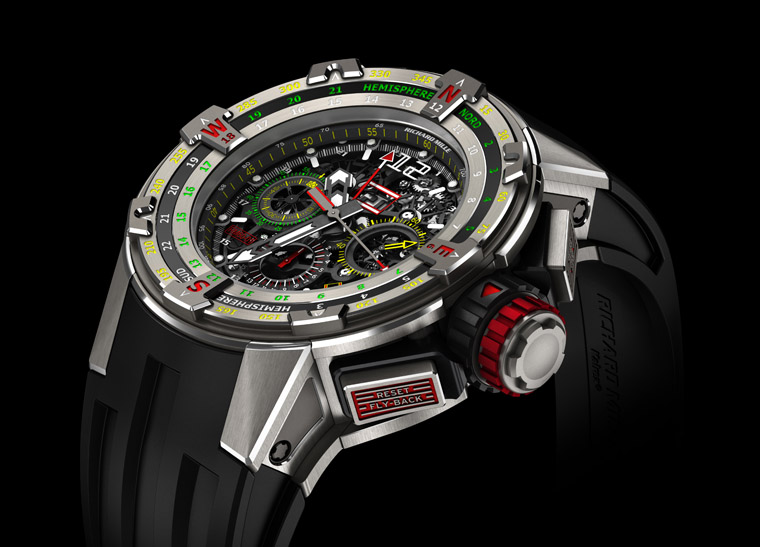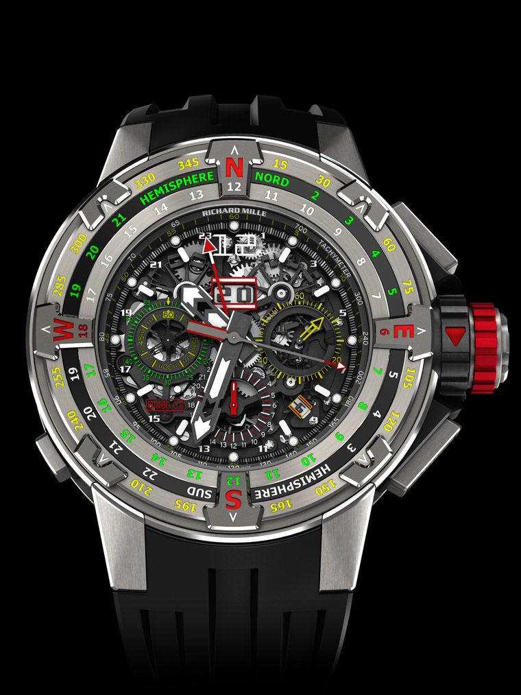 钛金属材质/RMAC2自动上链机芯/时、分、小秒、日期、月份显示/世界时间显示/两地时间显示/计时码表功能/倒数计时功能/蓝宝石水晶镜面、透明底盖/表径50mm