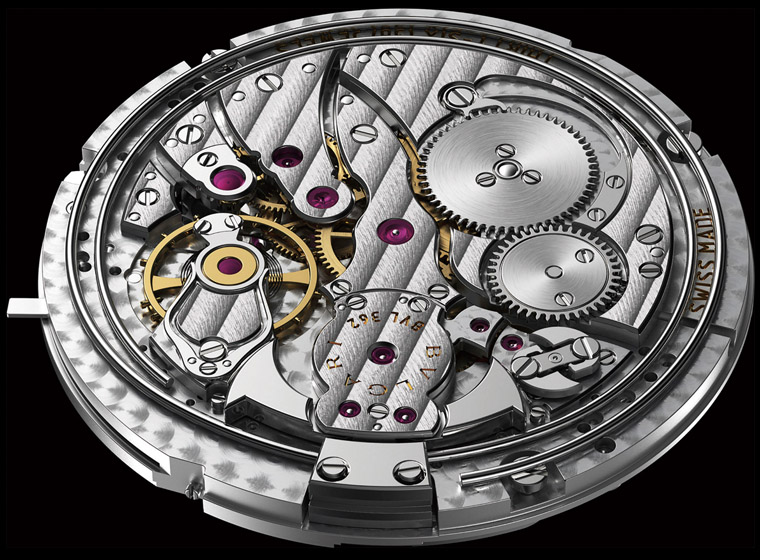 BVL 362机芯内报时系统的离心式调速器仅设置两枚平衡砝码,报时启动装置也并非传统的拨桿式,而是採用按把装置来启动。