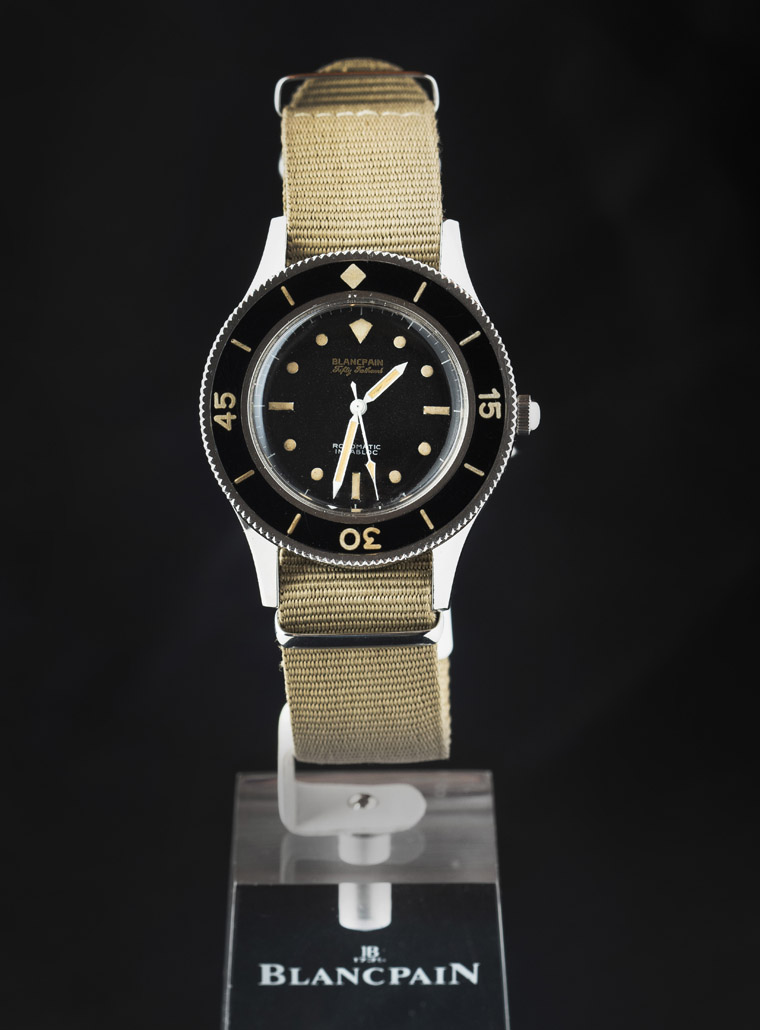 1953年问世的宝珀Fifty Fathoms五十噚系列开启了专业潜水表的新篇章。当时法国海军刚成立了一支精英蛙人突击队,法国海军上校 Robert Bob Maloubier急于寻找一款执行深海任务时可精准读时的腕表。时任宝珀执行长的Jean-Jacques Fiechter本人就是业餘潜水爱好者,以自身在潜水运动中的经验和需求为基础,研发出一枚适合潜水的高性能腕表。两者一拍即合,于是推出了这款名为「五十噚」的腕表。随着五十噚的问世,当年宝珀为潜水表制定了七大准则,时至今日,当代潜水表仍然遵循1953年五十噚立下的标准。对照1996年国际标准化组织制定的ISO 6425潜水表标准认证,两者大同小异。由此可见宝珀五十噚的开创性地位。