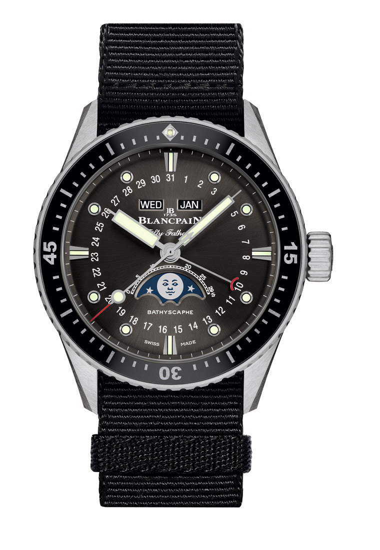 不锈钢材质/6654.P自动上链机芯/时、分、秒、日期、星期、月份显示/月相显示/蓝宝石水晶镜面/防水300米/表径43mm/参考价:NT$ 471,000