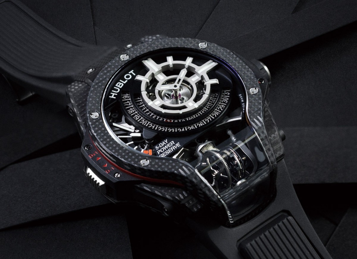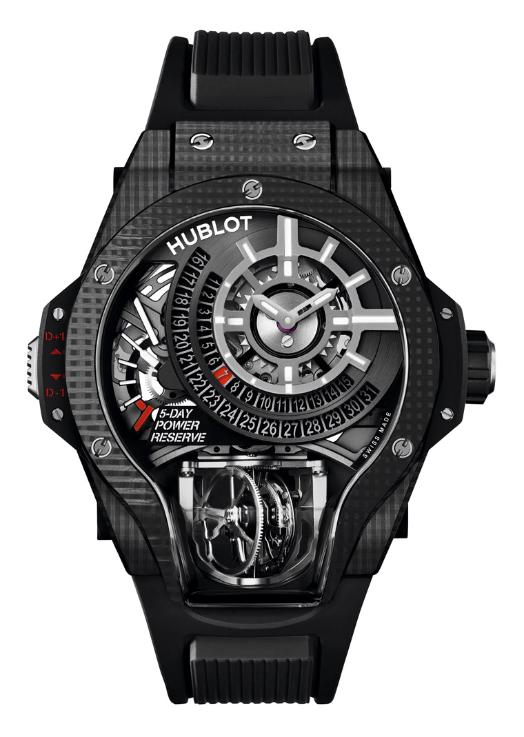 碳纤维材质/MHUB9009.H1.RA手动上链机芯/时、分、小秒、日期显示/陀飞轮装置/动力储存显示/蓝宝石水晶镜面/防水30米/表径49mm/限量50只/参考价:NTS 5,886,000