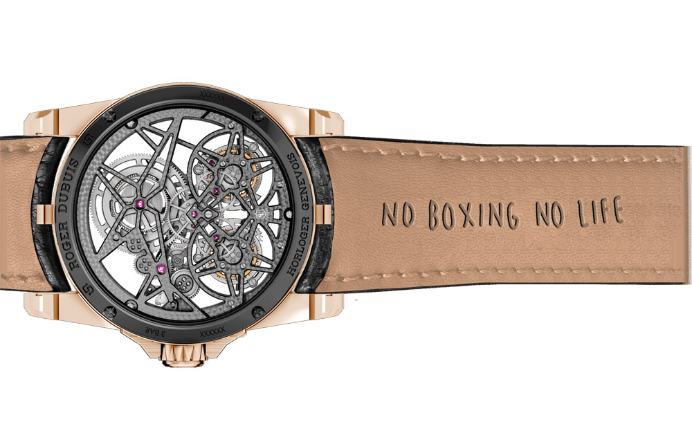 为了见证此强力联盟的首次出击,罗杰杜彼隆重推出品牌标志性Excalibur Automatic Skeleton自动上链镂空系列一款经过全新演绎的超卓时计。Excalibur王者系列以其精湛技艺和绚丽风采而闻名,生动体现品牌的创作精神,并成为品牌的极致经典。在如此重大场合首度亮相的崭新表款效法卡内罗的偏爱顏色,全面以黑色和金色进行诠释。除了採用这位冠军拳王的拳击手套制成表带以外,罗杰杜彼也发挥其卓绝技艺,将卡内罗的姓名首字母转化于腕表机芯的功能性元件「定位桿簧」上。如此装备独特的金色「冠军腰带」时计必然在拳击和制表史上皆留下鲜明印记!