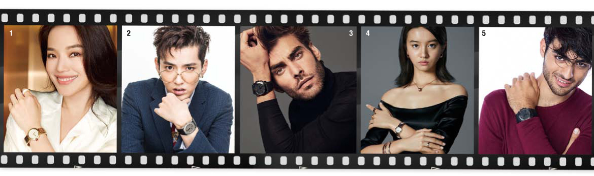 ▲(从左至右)1. 宝格丽品牌代言人舒淇;2. 宝格丽全球品牌代言人吴亦凡;3. 宝格丽腕表代言人Jon Kortajarena;4. 宝格丽品牌大使木村光希 ;5. 宝格丽品牌大使义大利知名男歌手Matteo Bocell。