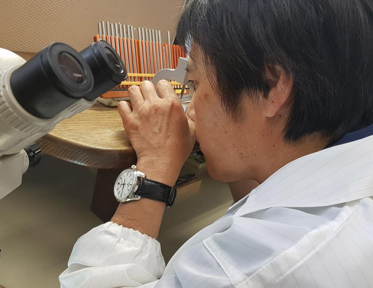 GS系列表款由位于长野盐尻的信州时计工坊所制造,包括设计、机芯、表壳、面盘与指针等,其中2018年发表的GS 8日链Spring Drive的手工制程比例很高,绝对可以媲美瑞士高级腕表的制作工序。日本人做高级表一向秉持职人的精神,除了在细节下功夫,对每个步骤都很讲究,比如要进入组装室前,需加穿全套防尘衣裤,帽子与鞋套(瑞士不需加长裤),并在防尘室内进行除尘处理(这步骤瑞士表厂没有)。制表需要热情,SEIKO表厂感受得到。