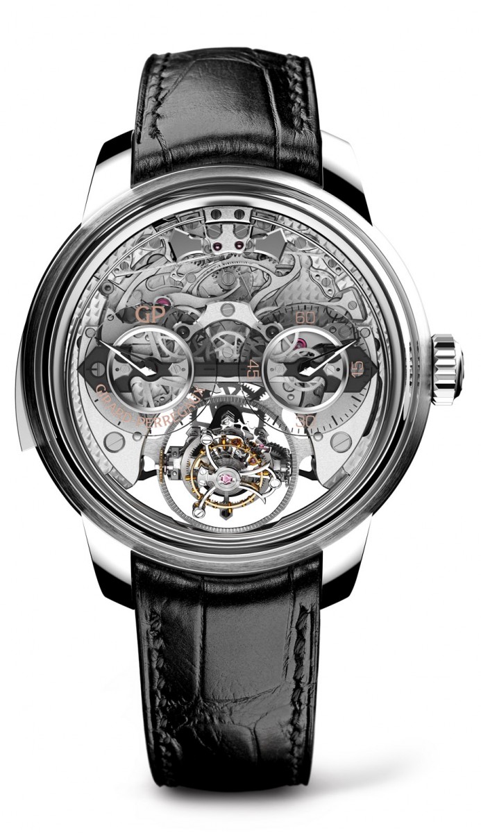 钛金属材质/GP09560-0001手动上链机芯/时、分显示/三问功能/陀飞轮装置/蓝宝石水晶镜面/透明底盖/防水30米/表径48mm