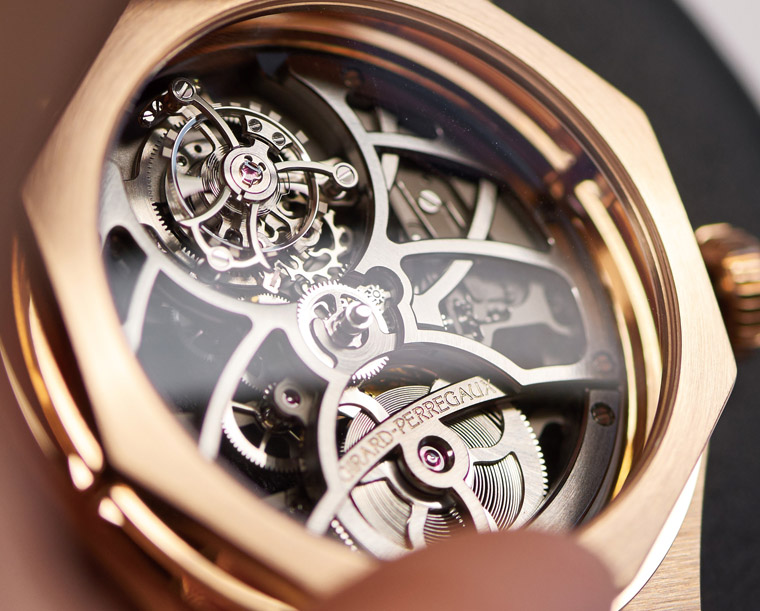 骨子裡大胆前卫的Laureato桂冠系列腕表,拥有独特美学设计的八角形表圈,是腕表设计领域裡公认的先锋。这个优雅的外型设计,更蕴藏着崇尚自然的完美时计典范。于1975年推出的第一代Laureato桂冠系列腕表,搭载震频高达32,768赫兹的超精确石英机芯,成为了制表工业的标准,更是当时性能表现最好的腕表之一。为展现芝柏表的制表工艺,并重申品牌一如传统对透明感美学标准的珍视,制表师特意把Laureato Skeleton Tourbillon镂空陀飞轮腕表那GP09520大型自动机芯的机板、表桥和自动盘镂通。这种无论从面盘或蓝宝石水晶底盖,都能欣赏得到其精细打磨和修饰的极致「镂空」工艺,每枚零件均由制表师以手工制作,让鑑赏家可以更深入地欣赏到这只由262枚零件组装而成、品牌自家研制机芯的内部机械结构。