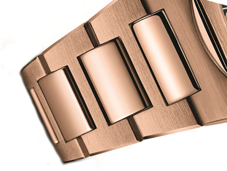 ▲腕表配上18K玫瑰金或白金表壳,衬以极富当代设计感的同种类贵金属链带,融为一体的结构设计令人一见倾心。