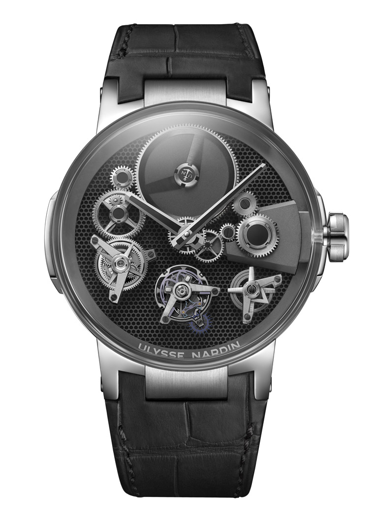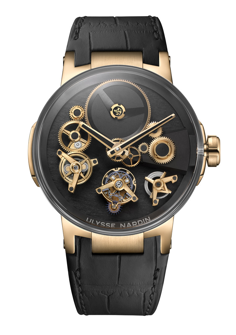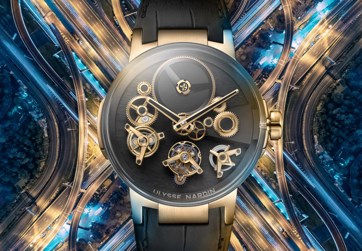 Executive Tourbillon Skeleton Free Wheel经理人自由之轮陀飞轮腕表是ULYSSE NARD雅典表迄今最引人注目的创作之一,彻底颠覆制表工艺,机械轮系在蓝宝石水晶玻璃下犹如太空幻境般的自在旋动。