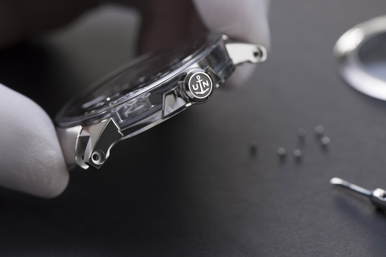 ▲表款没有表圈设计,而是採用「蓝宝石玻璃圆顶」覆盖表面,因此除了正面,在腕表侧面同样可以看见机芯的立体结构。