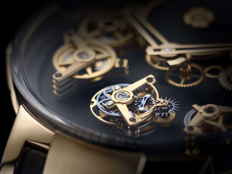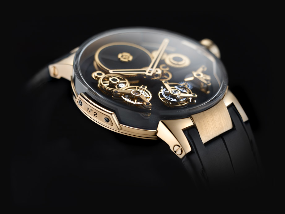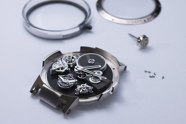 腕表最惊人的特点在于面盘的陀飞轮板桥、位于4时位置迴旋鏢般的7天动力储存显示、时针、分针和华丽的齿轮系统等其他元件,彷若悬浮在面盘上方。将这些彷彿「飞行」的组件笼罩其中的蓝宝石玻璃表镜则是另一项非凡设计。其复杂精致的效果,特别是表镜角度的打磨,唯有历经漫长而艰辛的实验方能成就。表背同样採用蓝宝石玻璃,只是此面不能透视内部,所有精致元件仅在面盘可见,彻底颠覆了制表传统。