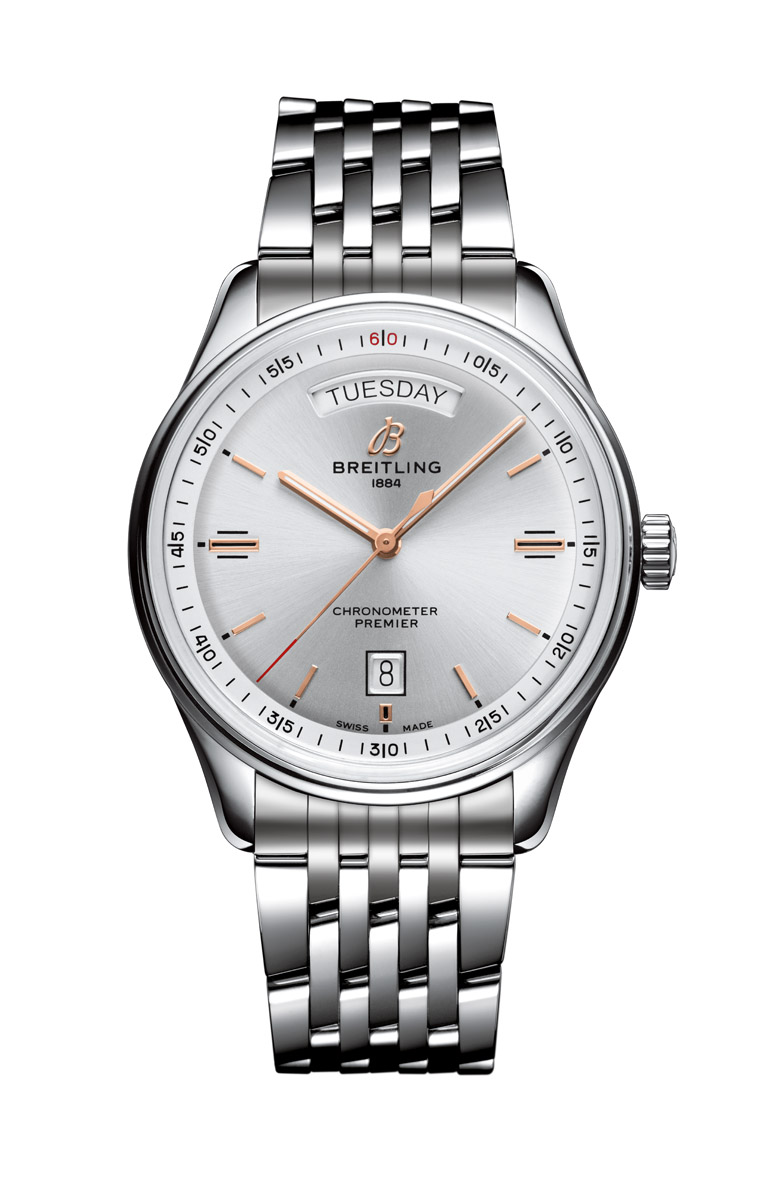 百年灵Premier Automatic Day & Date 40 自动腕表不仅显示时间,而且如其名称显示,12点和6点位置还分别设有星期和日期显示。自动上链的天文臺认证机芯——百年灵45型机芯——为这款自动腕表提供动力。Premier Automatic Day & Date 40 自动腕表可选黑色或银色表盘,配有不锈钢链带,或饰有白色缝线的磨砂绒面皮或鱷鱼皮表带。