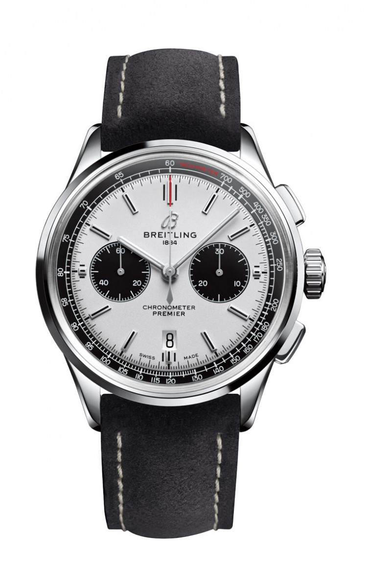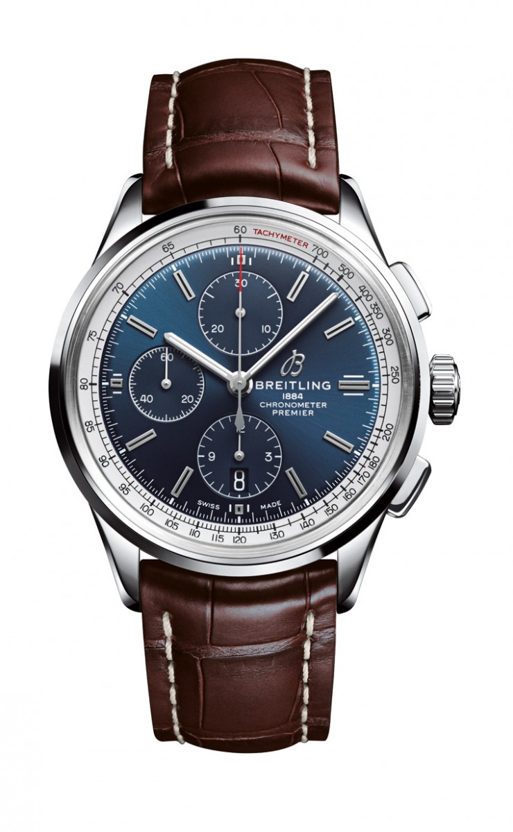 Premier B01 Chronograph 42 计时腕表搭载百年灵01自制机芯,是新系列中的旗舰腕表。百年灵自制01机芯是世界公认的最精密的机械腕表机芯之一。这枚经瑞士官方天文臺认证的计时机芯拥有超过70小时的动力储存。百年灵Premier B01 Chronograph 42 计时腕表採用坚固的42毫米不锈钢表壳和透明底盖,配有深蓝色或银色面盘。深蓝色表款可选择饰有白色缝线的蓝色鱷鱼皮表带或棕色磨砂绒面皮表带,或不锈钢链带。银色表款可选黑色磨砂绒面皮表带或鱷鱼皮表带,或不锈钢链带。简洁的表盘设计採用对比鲜明的黑色小表盘——3点钟位置设有分钟计时器,9点钟位置设有小秒盘,6点钟位置设有日期视窗。每个表款的黑色内圈上均配有白色测速刻度。