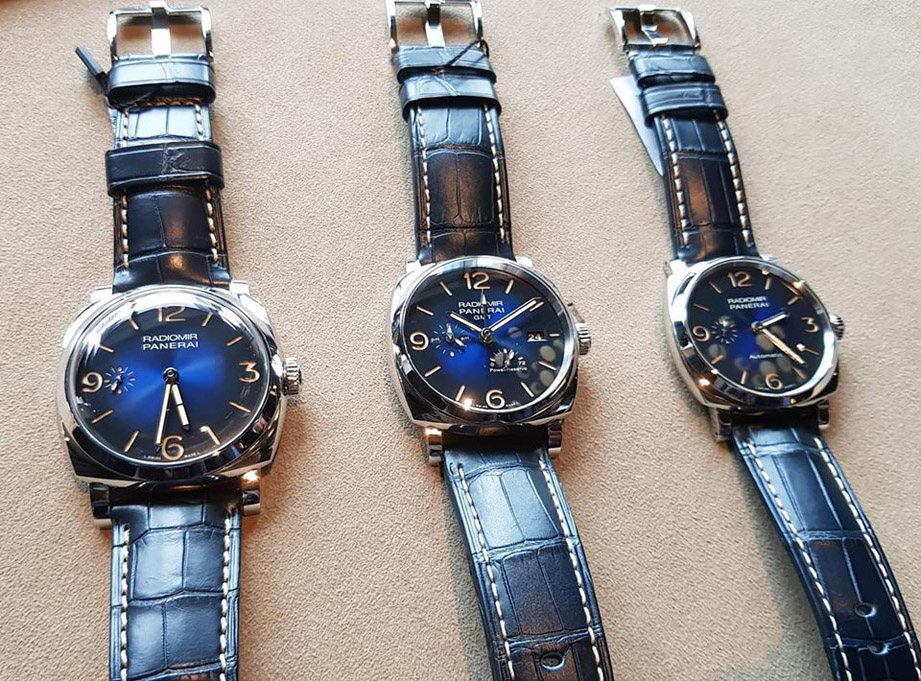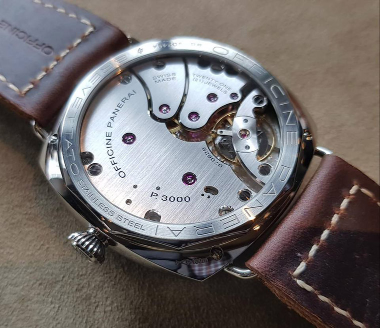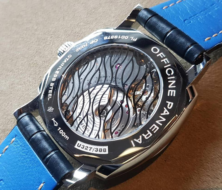 2018年品牌最新款PAM00790(黑面)与791(象牙白)领衔演出,为保持原创,是第一款没有夜光的PANERAI。搭载矛形指针、轨道式刻度,挺特别的设计。PAM00779为加州面盘,首次使用Bund Strap军用表带,DLC表壳、8日链,帅气,这只我喜欢。还有蓝色面盘的专卖店独家贩售款,非常蓝的绽蓝,让人感觉海阔天空。专卖店款表背有特色,在水晶镜面下方有金属波浪纹,这也是第一次出现在品牌手表上(如下图)。还有多款造型优雅又酷炫的款式,可到专卖店或授权经销商细细鉴赏和品味。