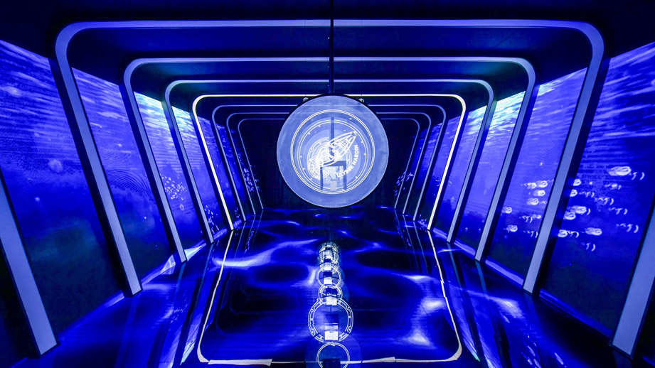 随着海浪的起伏,雅典表的标志在雾屏上如幻影一般迎接着每一位客人,奇想在变幻莫测的空间裡表达着自己的不羈主张。陈列在罗马柱展示柜裡的腕表,此刻化身为大海中的失落宝藏。客人们还可置身在全息奇想空间中,任凭光线的魔法将自己投射成许多个影像,与游动的大鯊鱼或奇想腕表合影,历险还生。