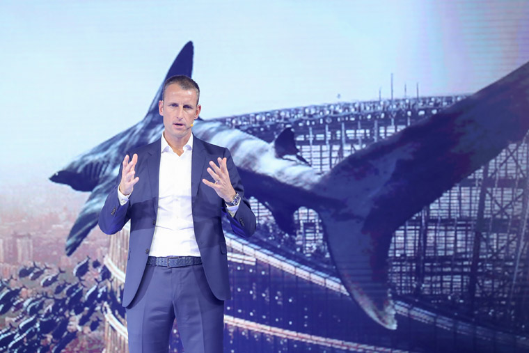 大白鯊来了!现场环形屏幕的一侧,一只鯊鱼畅游在纽约的街道上。随即,更令人惊讶的是,它竟游到了上海,游向了我们。出乎所有人的意料,这只鯊鱼在舞台中央从天而降。捕食者来了!这惊险一幕转瞬即逝。此时灯光艺术家再次回到舞台上,乐音开启,让大家回味和再次拥抱这难以置信的一晚。