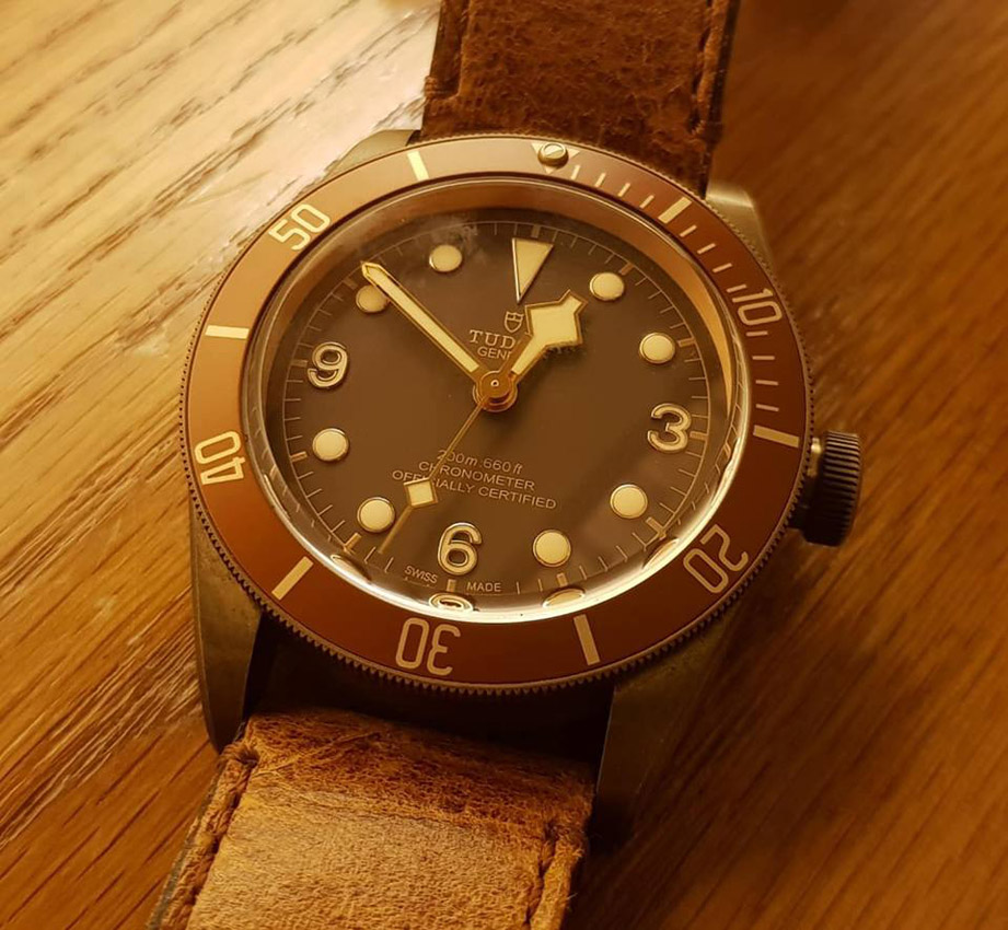 目前无论正宫、非主流与致敬青铜表何其多,TUDOR青铜表是众多品牌中订价5000美金以下、搭载自制机芯的款式中,性价比最高的表款。TUDOR青铜配方独特,含有约10%铝质,又称铝铜合金,可抗磨,耐腐,硬度更高。而当青铜氧化时会呈现温润自然色调而非铜锈。搭载自制5601自动上链机芯,C.O.S.C认证,储能70小时,堪称史上最强大,连贝克汉也佩戴。