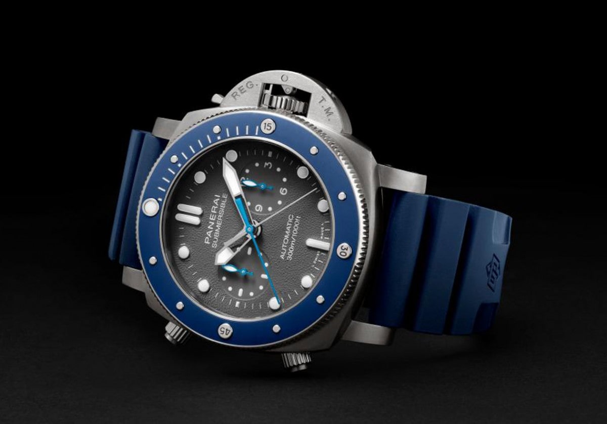 Guillaume Néry先前在《PANERAI Traits》短片中佩戴的是PAM01389这款潜水表,如今新作也是奠基于相同的系列基础,从表款身上的表冠护桥不难发现源自Luminor的血统,而且这款表同样採用钛金属表壳,最让人眼睛一亮的莫过于它的蓝色陶瓷表圈,印象中这应该是沛纳海首次使用蓝色陶瓷圈,雾面质感加上防刮不褪色的特性,搭配这只表潜水表的身份恰到好处。而在面盘上採用的鯊灰色颗粒纹也很有特别版的专属味道,搭配蓝色指针以及蓝色橡胶表带,突显出Guillaume Néry水中蛟龙的身份。